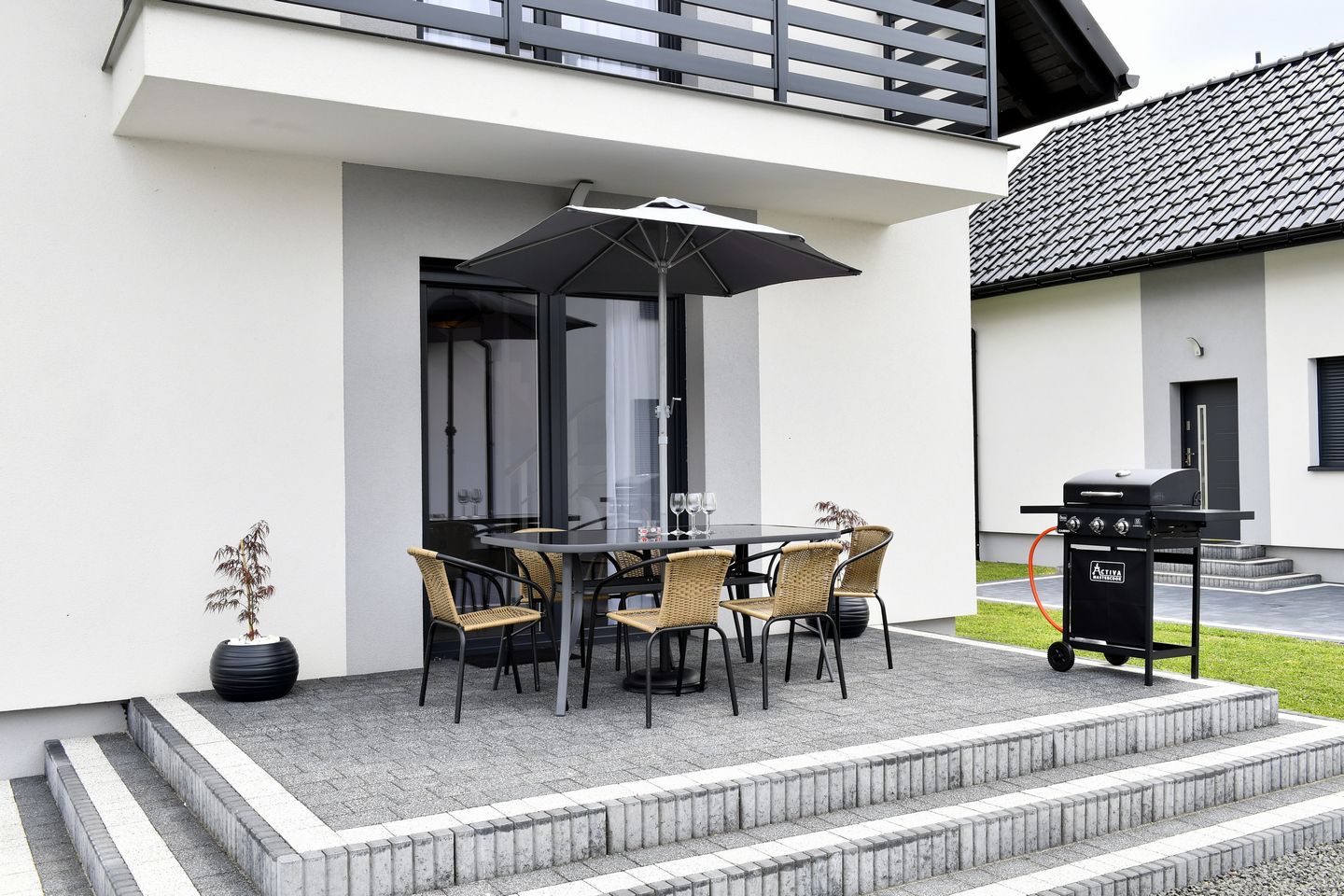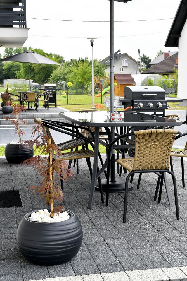 Do dyspozycji gości jest grill gazowy oraz meble ogrodowe, znajdujące się na każdym z tarasów.