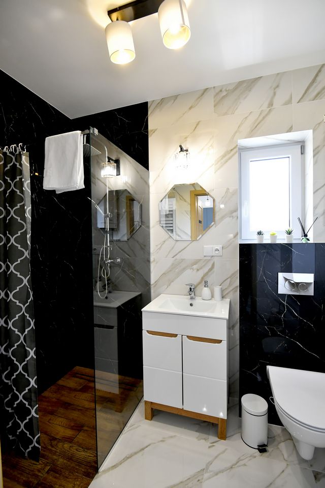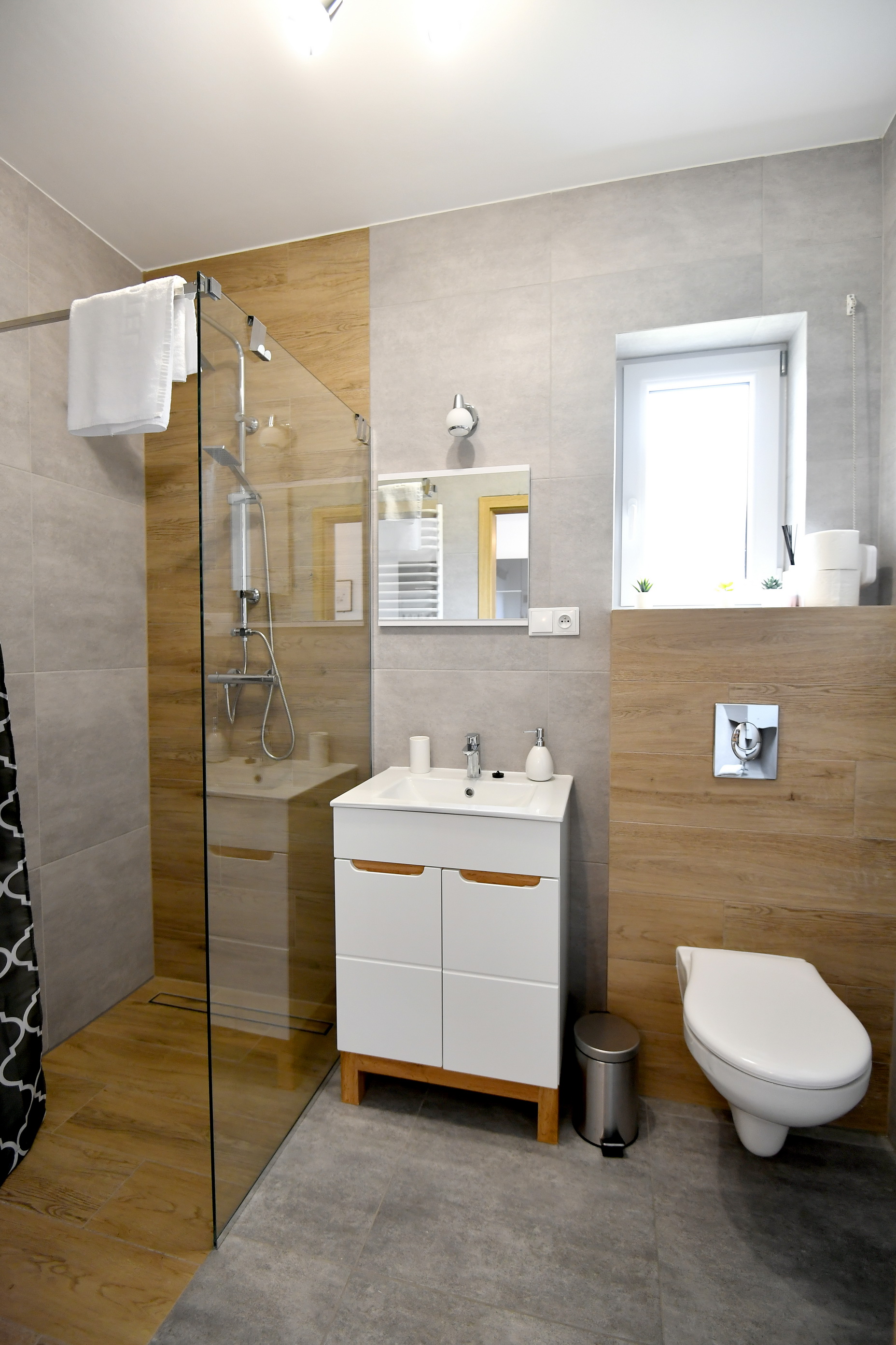 W każdym domku na parterze znajduje się salon z aneksem kuchennym oraz łazienka, natomiast na górze są dwie sypialnie i toaleta.